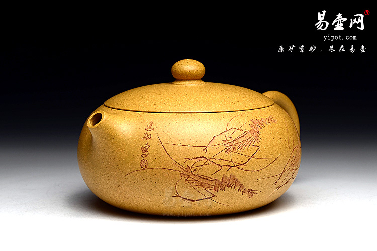 壶身正面篆刻有戏虾图,反面刻有“清风得趣”。由国家级助理工艺美术师 李卢春,号逸舠 操刀刻绘而成。