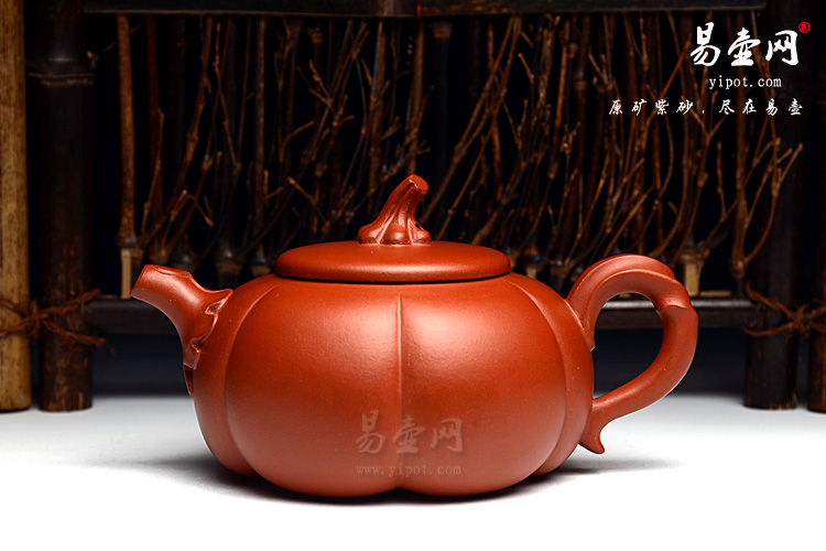 南瓜壶是紫砂壶中很常见的一种款型。此南瓜不仅外形酷似南瓜,更是集聚了南瓜的神韵,犹若瓜熟即将待落。壶钮、壶把皆以南瓜藤为原型,形象逼真。壶嘴则若南瓜叶包裹而成,精巧别致,创意极新。壶嘴处为一南瓜叶子,苍老却不失神气。此南瓜壶,显然活矣!