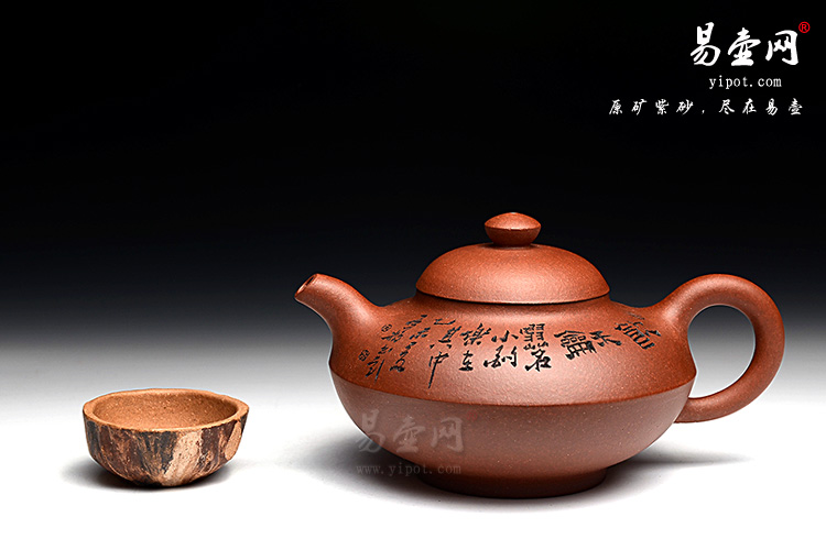 壶身正面刻有“饮和”,反面刻有两只鳜鱼戏水图。