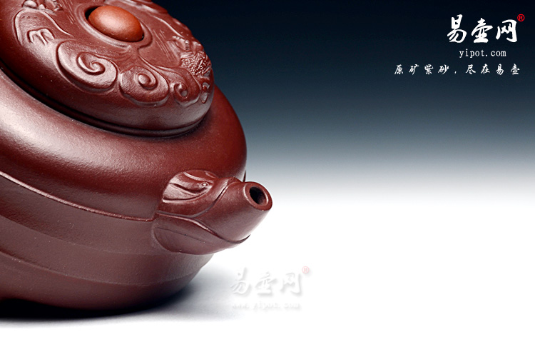 壶身呈扁圆造型,三鼎足稳重端庄,环线古朴简洁。壶嘴弯流上翘,粗细过渡简洁,以龙首装饰,朴雅大方。壶盖平整光滑,双龙戏珠装饰精美华丽,龙首图案在一片祥云围绕中若隐若现。环形壶把用龙纹装饰,纹理清晰细致,力道十足。