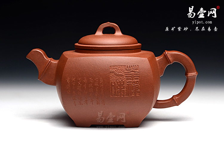 天地方圆壶是紫砂壶中的经典款型之一,该壶则是在继承传统中有所创新,以竹节为形的壶把、嘴、扭,劲爽古朴之中,更有新意。壶体四方,点、线、面清晰明确,衔接自如,线条流畅,壶身挺俊,大方简洁。竹节勾勒成的流把钮与“方”的元素结合自如,暗蕴力度。该壶正面的挑砂刻有“茶禅一味”,亦庄亦谐,壶反面刻绘的山水,雅致清幽,令人玩味无穷。