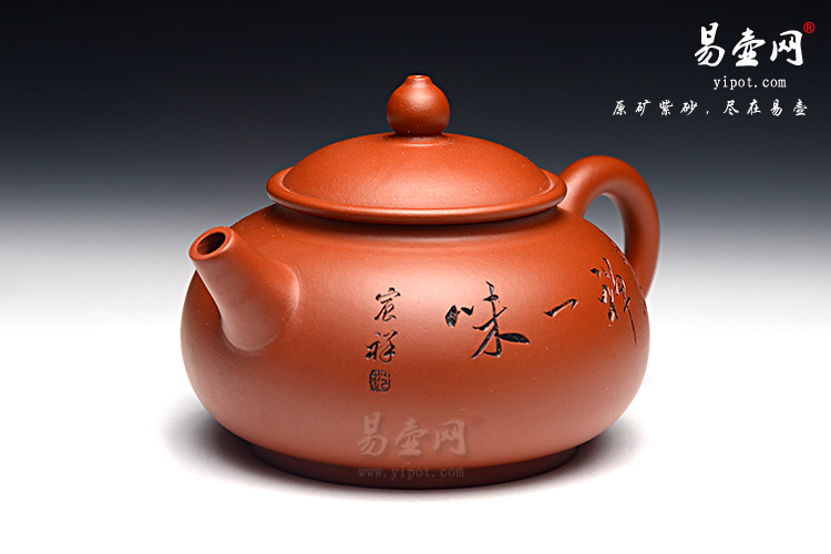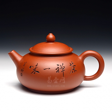 此壶造型小巧美妙,刻绘的“茶禅一味”和莲花图,让人把玩欲罢不能。