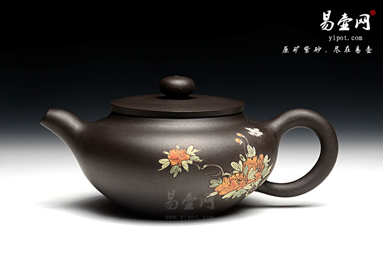 整壶黑泥的用料将壶身将紫砂壶典雅古朴的气质巧妙体现,壶身泥绘的牡丹图美丽动人,反面泥绘有“花开富贵”寓意美好。壶体虽然不大却似一副颇能吐纳之姿。由于做工精细,实用价值高,冲泡出茶汤温和醇香,韵味悠长。