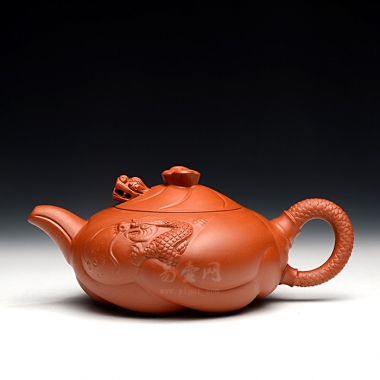 此壶质感柔亮,红润细腻,大放异彩。鱼化龙以神话故事为题材创作而来,作品构思巧妙,将鱼、龙以及云的装饰与壶融为一体。此款作品经过 老师的精心制作,刻绘精细,出神入画,就感觉真有一条龙在其上盘旋。壶盖上的龙头可动,十分的奇巧俏丽,整款作品制作浑厚有力,精致而不繁琐。此壶兼具实用价值和艺术价值,值得珍藏。
