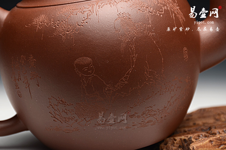 壶身正面刻绘“题品云山归画卷,收罗风月入诗篇”,反面刻童趣图。