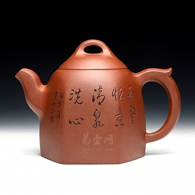 此种壶造型似由秦权壶发展而来,是一款方器壶,但是壶又与圆的艺术完美融合,对于方器要求做到“方中寓圆,方中求变,口盖划一,刚柔相称”的境界,您仔细品味此壶便能看到其自身的优势所在。壶身如同秦权壶身,又被几条直线分隔成六方,此壶风格气质压人脱俗,造型流畅灵活,虽不追求工巧雕琢,但匠心独运,朴雅坚致,妙不可思,壶身由徐建刚老师装饰,建议收藏。