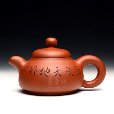 壶身较为厚实,加底设计玲珑精巧,身筒外线条圆润,壶身正面篆刻的是“江流天地外”五字,字体灵秀飘逸,俊逸非凡;壶身反面篆刻的是“山水图”