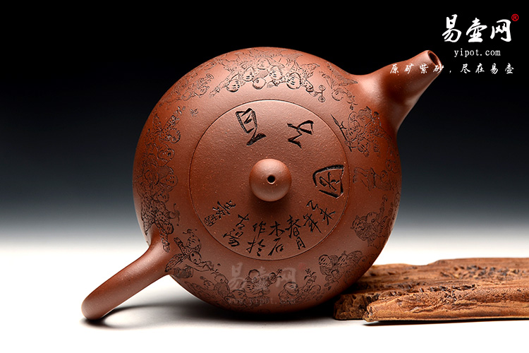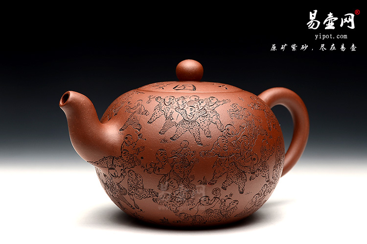 壶身由陶刻名家周伯其(木石)老师操刀镌刻而成,刻有《百子图》刻绘的百子图繁琐精美,无数个儿童神态各异,非常考验功力和耐心,也极大地增加了壶的收藏价值。