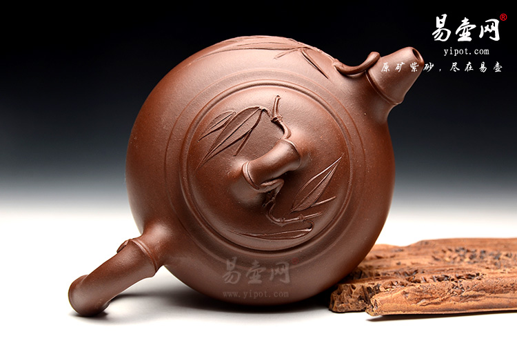 该壶以竹子为原型,整器圆融饱满,的流把竹节装饰,是一款用料上乘的花货。的流把竹节造型,壶身圆融饱满,乳丁足设计,壶钮以竹枝为原型,竹叶于壶钮和壶身相接处胥出自然。端把处以竹节为型,弯曲呈圆耳状。壶嘴竹节状微微 弯曲向上,所贴竹叶,自然真切。具有极高的欣赏和把玩价值。