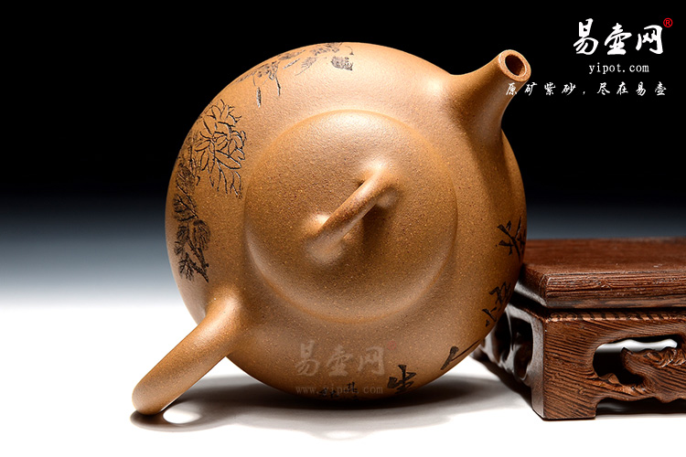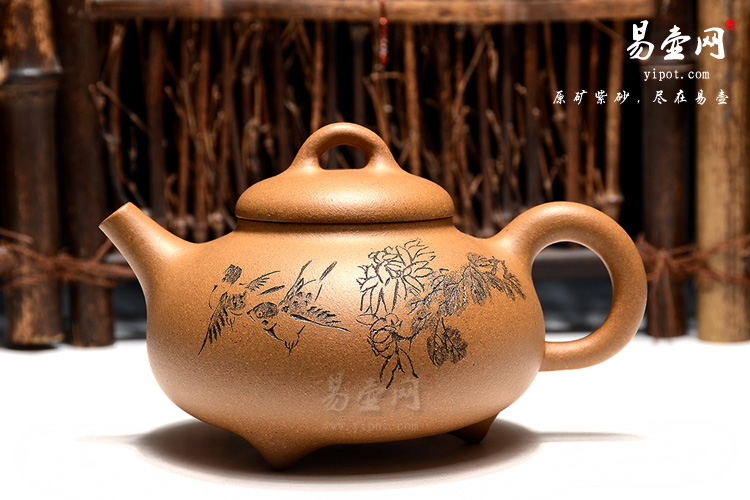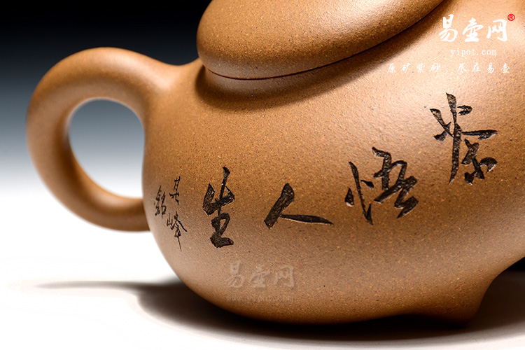 壶身正面镌一对小鸟悠然其乐,反面铭文“茶悟人生”。