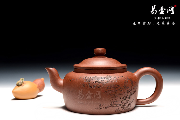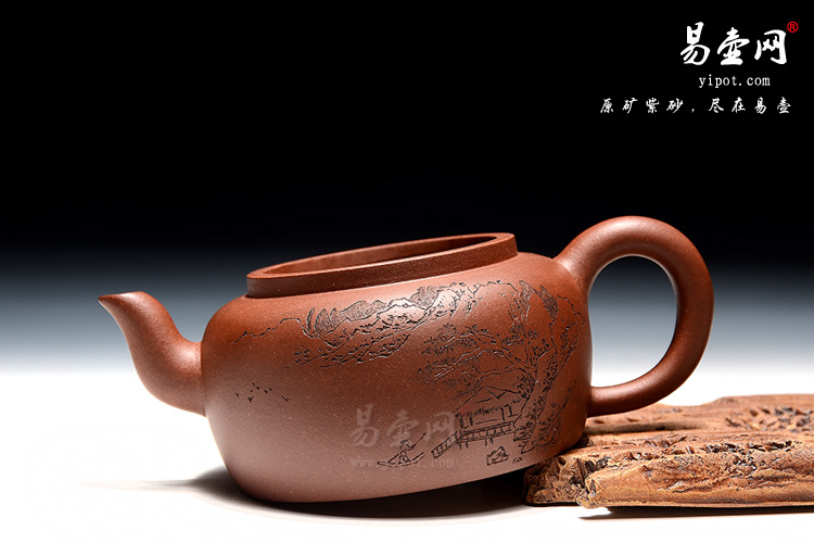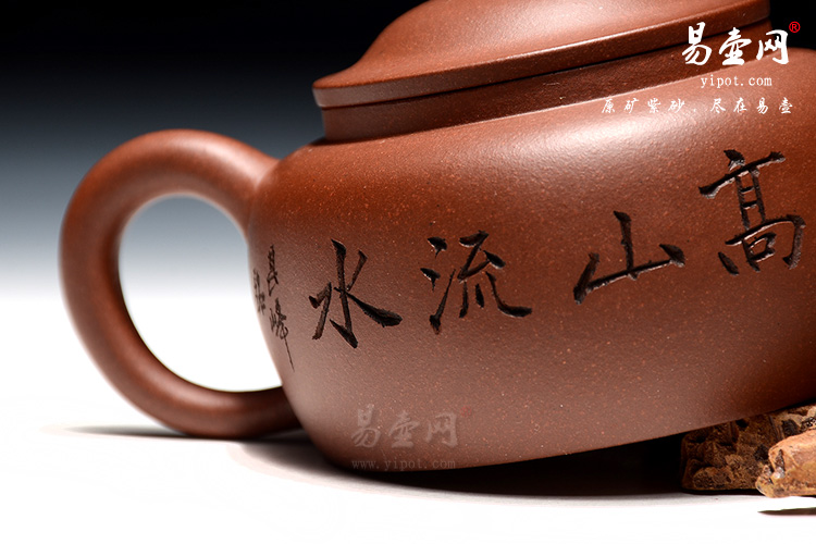 斗笠壶,秀美的隐士情怀,敦厚朴实的造型,刻绘的刀工精致、刻绘细腻。正面刻的是一副高山流水画,反面镌刻“高山流水”,无一不表现出一种朴实无华的隐士情怀凸显无疑,采用一厂老料底槽清,色泽温润自然,有天然去雕饰之美。