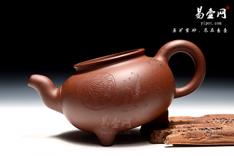 壶身形态丰盈饱满,轮廓异常突出。压盖对接严密,边沿光滑细腻,鼓盖较为平滑,桥型壶钮有点睛之妙。三弯流壶嘴粗细均匀,承承而立,甚是高雅特别。耳把斜立壶身,圆润大方,更加动人。再加上三鼎足来拱卫,此壶更显气势非凡。