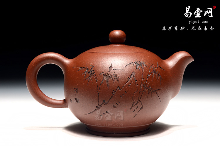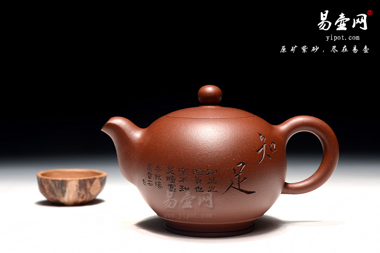 纯熟的的手法精工细作,造型雅致,线条流畅,比例恰当,二弯流与圈把对应,以暗接手法融合于壶身,壶钮浑圆,该壶气势优雅,力感强,并具神韵气质;此壶别具一格采用加底设计,壶身顿时拔高,显得古穆伟岸;壶身刻绘细腻而大方,正面篆刻的是“知足”两个大字,旁有“知足之时贫也乐,不知足是富亦忧”两句,意味深长,篆刻细腻,反面刻有清风石竹图,美轮美奂,有陶刻老艺人“云石”(汪健)老师操刀装饰而成。