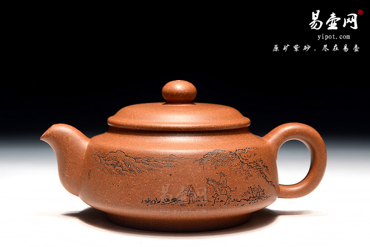 壶身正面刻绘山水出游图,反面铭文“意静似水,心闲如云”,由实力派陶刻家“马力”操刀镌刻