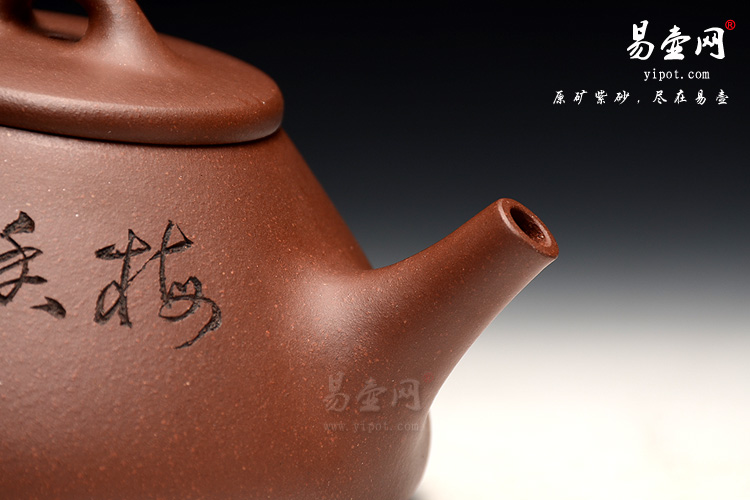 此壶为经典的石瓢造型,此壶下大上小呈三角形,周身皆以圆弧线条构成,流、把、钮处处衔接自然流畅,线条清爽利落,起承转合自如得体。壶嘴、壶把、壶身三位一体。底部三圆足立起全身,使壶显得挺括有神,展露出一种大气风范。壶面刻绘一壶香茗梅花图,反面镌刻“梅香入梦”,展现出文人气派,值得赏玩收藏。