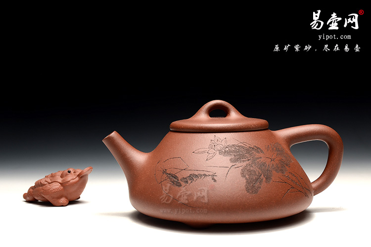 此壶为经典的石瓢造型,此壶下大上小呈三角形,周身皆以圆弧线条构成,流、把、钮处处衔接自然流畅,线条清爽利落,起承转合自如得体。壶嘴、壶把、壶身三位一体。底部三圆足立起全身,使壶显得挺括有神,展露出一种大气风范。壶正面刻绘"荷塘戏虾图",反面镌刻“和风入室”,展现出文人气派,值得赏玩收藏。