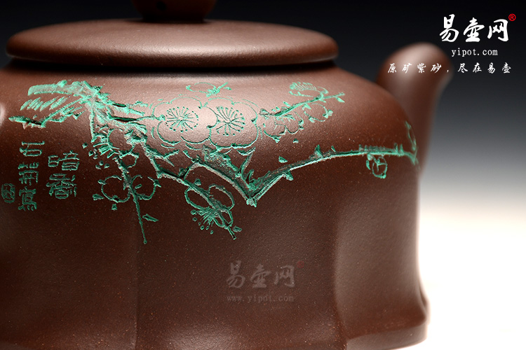壶身刻绘装饰亦是作品的亮点,刻有“凝雪”小字落“老干纵横色如铁,历经春秋仍从容”,反面刻绘有暗香梅花图。