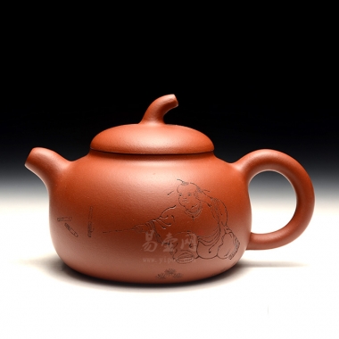 这款茄段的美妙之处在于似真似幻,在具体和抽象之间轮转。以生活中常见的茄子为型,用圆润的线条勾画出茄子的动态之美,与常见的茄段不同此款造型憨胖,敦实厚重,沉稳有力,壶钮为如茄蒂,逼真自如,流与把舒畅自如,工艺精到。加之壶身刻绘的景物,更贴合自然之感。
