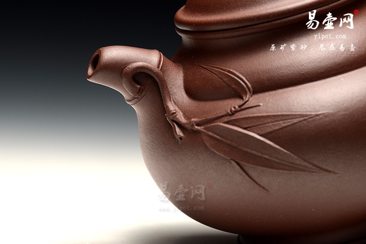 此壶精选原矿底槽清泥料全手工制作,做工非常细致的小花货,泥料的色泽更是光鲜照人,惹人喜爱;整个壶体是自然和生活的巧妙融合,壶嘴,壶钮,壶把均是以一小节竹节弯曲而成,尤其是壶钮和壶嘴衍生出的竹叶,显出一种活泼调皮的韵味;壶嘴竹节上一直竹枝伸出,几片竹叶随风招展,覆盖在壶的表面;整洁光亮的壶身平添了一丝清新逸趣;壶钮微鼓,压盖式,盖面圆润,自壶钮胥出的竹叶细腻飘逸。