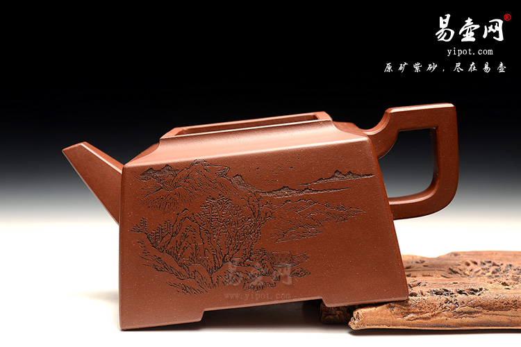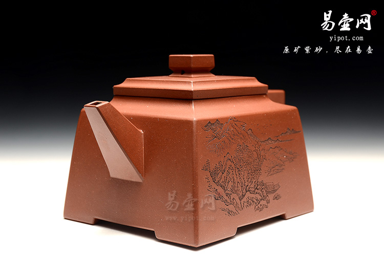此壶名为君方,原矿底槽清精制而成,颜色古朴大气,沉稳脱俗。该壶方形线条对称工整,方形轮廓清晰自然,壶钮四方,造型朴实无华,坦然有趣若君子之风,正是因此得名为君方。壶身的刻绘非常难得,乃是正面山水画,另一面刻绘“兰陵美酒郁金香,玉碗盛来琥珀光。 但使主人能醉客,不知何处是他乡”。工整飘逸,洒脱灵动。