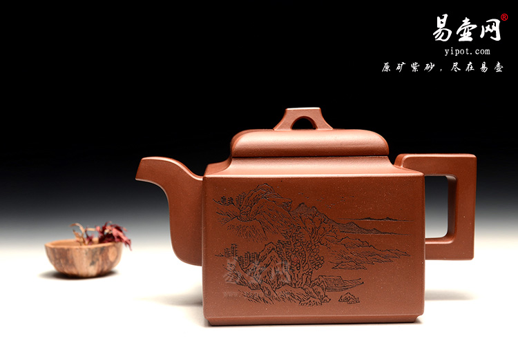 其实,亚明四方是方器中经典的器型之一,是著名书画家亚明先生所设计,故而称之为“亚明四方”,作为方器中的经典款,有着古朴典雅的造型,又有浑厚大气的特点。而作为此壶,值得称道不仅是亚明四方共同具有的器形特点,更值得称道的是此壶的装饰工艺刻绘。该壶正面刻绘的是“山水画”,景色亮丽,足以畅怀,另一面刻绘“天行健,君子以自强不息;地势坤,君子以厚德载物”