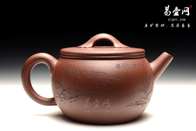 此款作品,造型敦厚、稳重,壶身双面刻绘,正面刻绘诗句“一叶香茗藏世界,半壶清泉煮乾坤”;壶身反面刻绘山水,溪山图,刻绘刀法刚劲有力,自成风格;大口设计泡茶、清洗都十分方便好用,做工极其精美;壶钮为经典的桥型钮,拿捏舒适;此款作品,采用全手工制作,收藏升值。