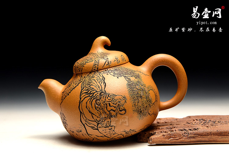 精选黄金段泥制作而成,工料极佳,壶身刻绘的猛虎下山,栩栩如生。下山虎虎鬃虚乍,虎眼圆睁,虎视耽耽,是一直凶恶至及万夫莫挡气质,表现个人的凶猛干练。另一面刻绘“虎啸生风”。
