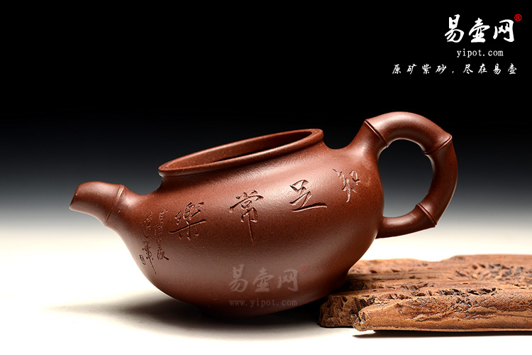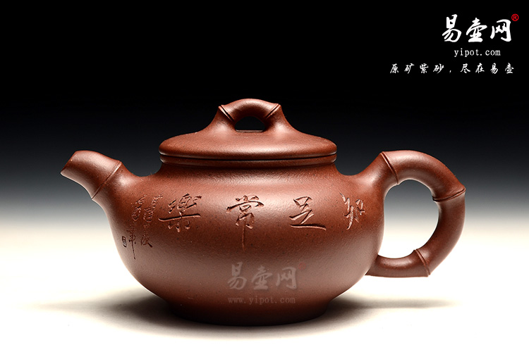 这是一款以“竹”为主题的作品,“竹”代表的是“祝福”的意思,寓意很好;壶身圆润可爱, 加之原矿底槽清的色泽,醇和内敛朴实无华,嘴、钮、把均是竹节造型,竹节形桥形钮苍劲有力,压盖设计,更显立体感,古拙老味,是一款气密性极佳的好壶;这款壶壶身装饰的竹叶并不是贴花的形式,而是采用了刻绘的形式,素刻的一枝竹叶苍古、飘逸,灵秀之美呼之欲出;壶身正面篆刻的是“知足常乐”四个字,寓意浅显而美好,壶身极为饱满,像是装满了福气,沉甸甸的样子。