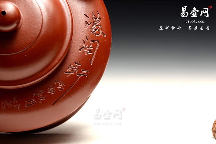 此壶器型源于虚扁,泥料选用大红袍,红艳夺目,气质高雅,令观者满受瑞气临身,鸿运当头之意。一弯流,嘴头处理干脆利落,略微下沉,呈外伸飞逸之势;扁圆钮与壶身相应和。 如帽盖设计,古朴典雅;耳把随圆,与壶嘴同样呈外伸之势,整个壶在横向感觉张力十足;整只壶线条明细,扁而不虚;为经典而简单的虚扁式样加以高身桶的创新设计,实用而雅致,细节精细,大处舒展,实为赏心悦目的好壶。再观其色泽,通体上下剔透匀亮,似波光般潺潺不断,所以名为水扁,真是名副其实。