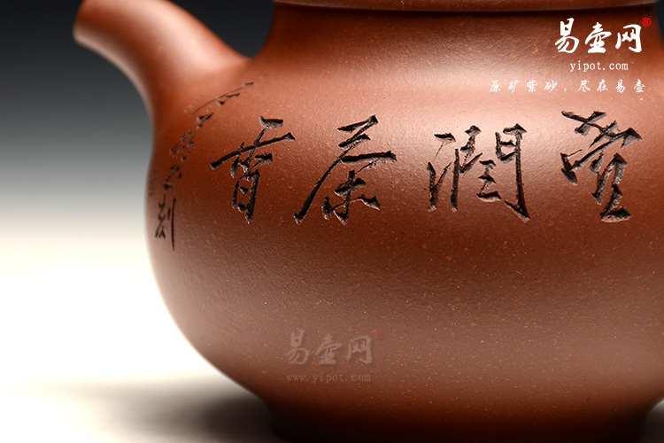 壶身一面刻绘“壶润茶香”,另一面刻绘花下茗壶图。