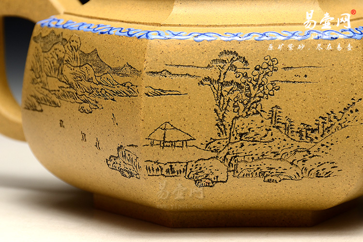 点彩装饰,让人眼前一新别是一番味道。壶身刻绘“山随画活,云为诗留”,另一面刻绘山水画。