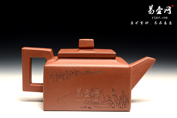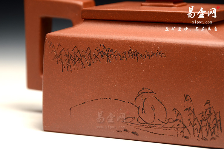 杨立平的此壶,是经典的紫砂方器。壶身呈现长方形,规整大气。精选原矿底槽清泥料制成,泥质醇厚,色泽古穆,触手生温。该壶采用刻绘装饰工艺,壶身刻绘由陶刻名人徐建刚,正面刻绘的是“清泉洗心”。壶反面刻绘的是垂钓图,颇有韵味。此壶意蕴深远,值得珍藏。
