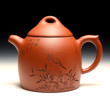 壶身正面刻绘竹子花鸟图,壶身反面篆刻“清风竹影”,文雅至极。