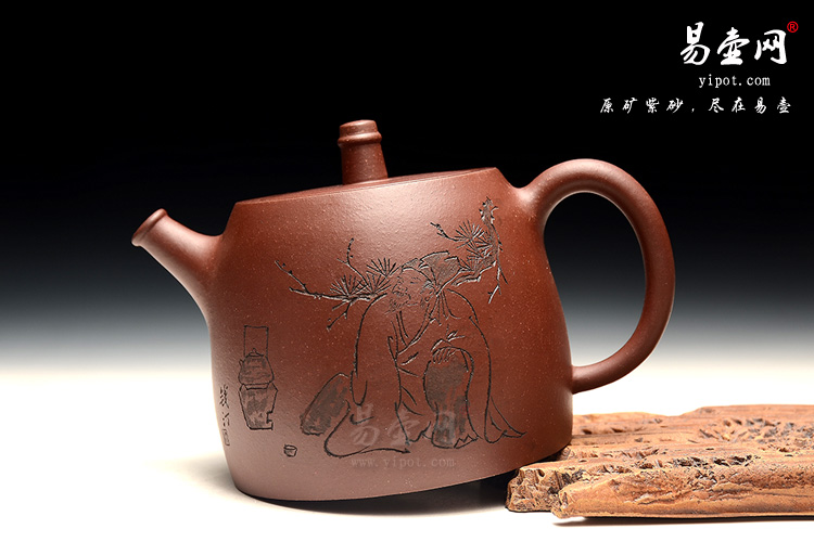 壶身一面刻绘居士松下煮茶图,另一面刻绘“性随怡养”,有陶刻名人钱汀刻绘装饰而成。