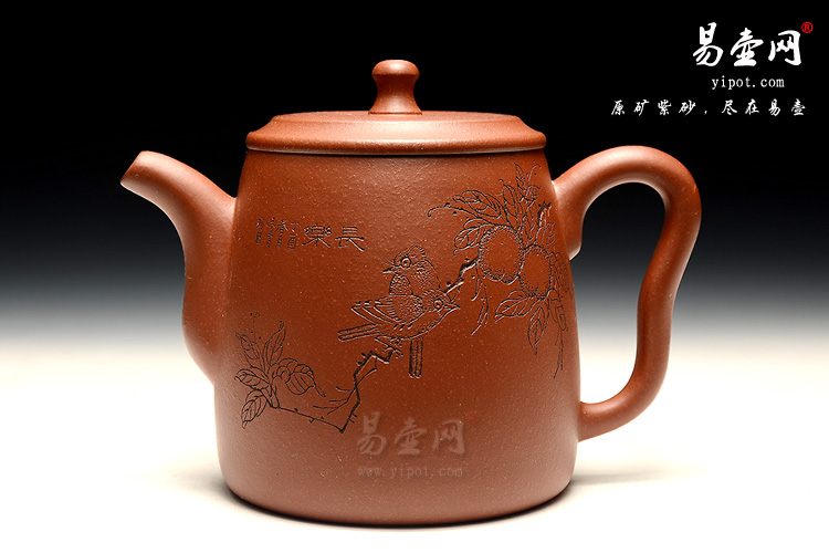 壶身篆刻书法字体,苍劲有力,刻绘“长寿花鸟寿桃图”和“清茗一杯,诗脾可沁”,更加彰显了紫砂壶的古典美。