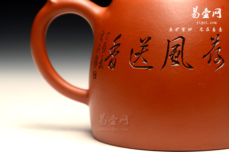壶身一面刻绘荷塘清趣图,虾戏荷花,另一面刻绘“荷风送香”。