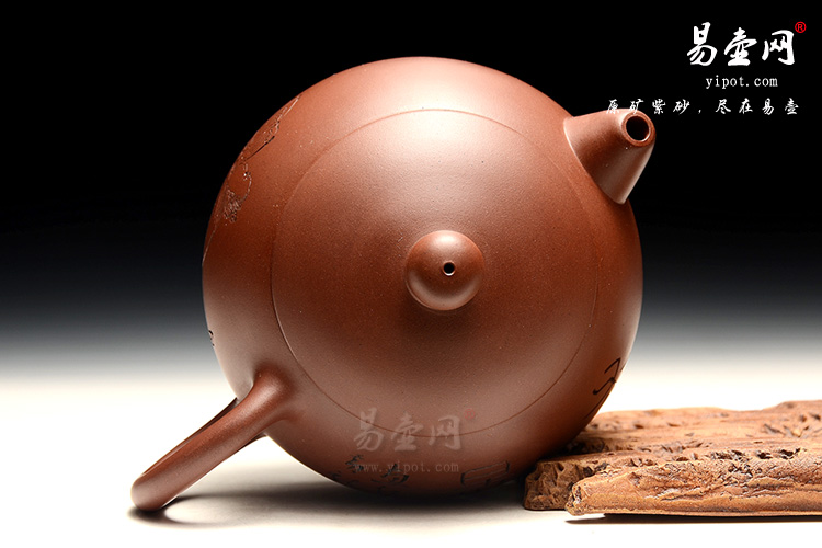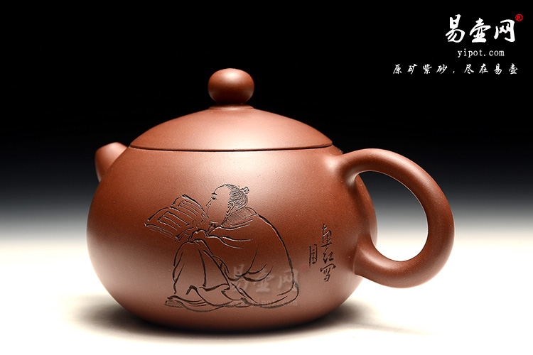 此款西施由陈惠红老师心灵手巧之作,壶身一面刻绘居士读书图,另一面刻绘“求是”。