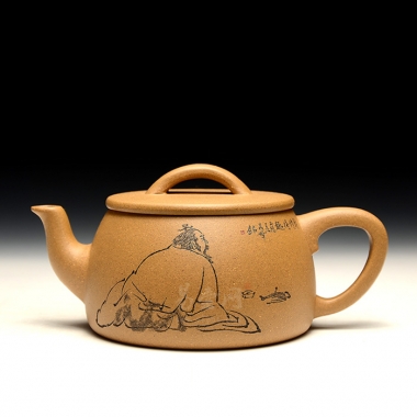 此款云瓦器型取自汉瓦与石瓢,经由余潇老师制作,表现出大气,不能不令人惊叹!此作品以简洁的线条构成淳朴凝重的形体,深厚且具神韵,有端庄古朴之意境,作者对壶的形体可谓吃透了要点,汉瓦之桥扭,壶身刻绘“居士品茗图”和“汲古传心”苍劲有力,刻绘细腻,如此一把古香古色味浓厚的壶型又怎能不让人喜欢呢!