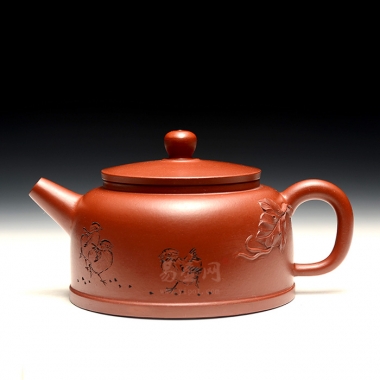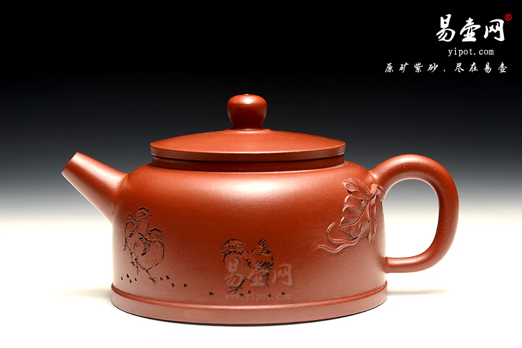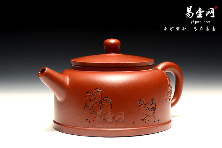 此壶选用精品大红袍制成,通体上下华丽高贵,色泽红艳,让人爱不释手;壶体饱满,形制稳健;宝珠钮,直流嘴出水迅猛有力,平盖协调而雅致,将紫砂壶典雅古朴的气质巧妙体现,此壶特别适宜于闷泡大红袍系列,壶体虽然不大却似一副颇能吐纳之姿;贴叶装饰加上刻绘的几只小鸡生动妙趣、生机盎然,由于做工精细,实用价值高,冲泡出茶汤温和醇香,韵味悠长。