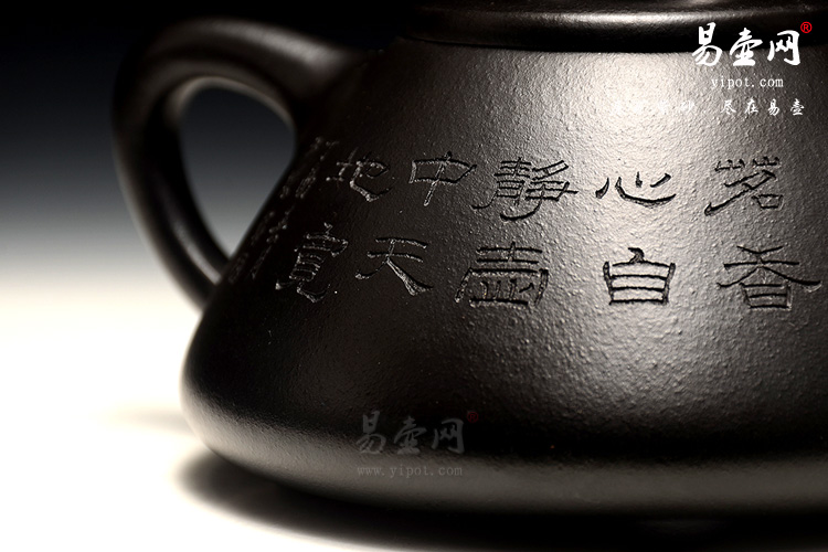 壶身一面刻绘山水画,另一面刻绘“茗香心自静,壶中天地宽”。