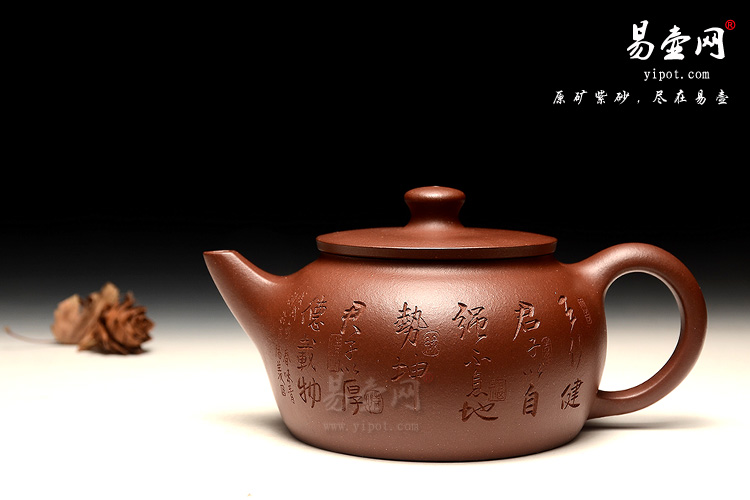 壶身一面刻绘有“天行健,君子以自强不息;地势坤,君子以厚德载物”,壶身另外一面刻绘有赏壶图。