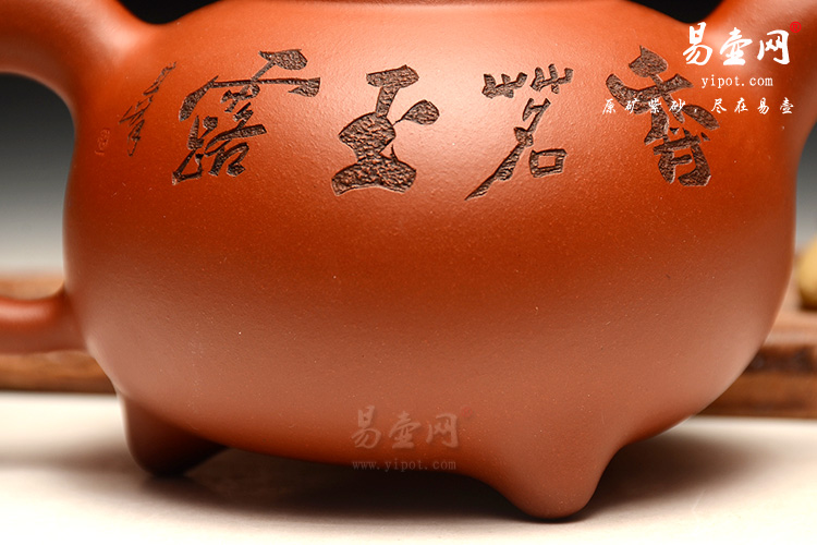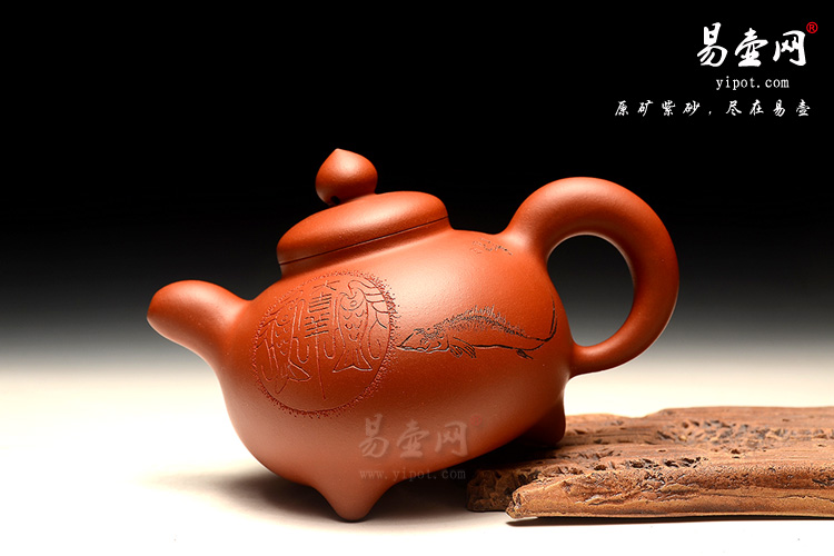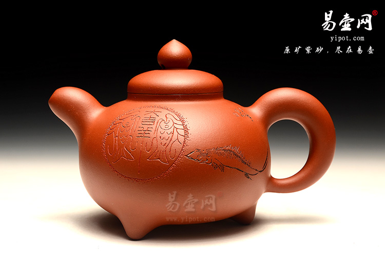 壶身由陶刻名家周其峰老师刻绘,一面刻绘图“大吉羊(祥)”年年有鱼图,另一面刻绘“香茗玉露”。