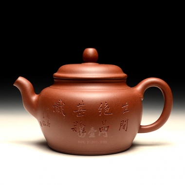 此壶稳重敦厚,造型神形流韵尽显贵态,若以此壶品茗,妙不可言!此壶整器浑圆饱满,福气满乾坤,有如一股内气通透;壶流、壶把、壶钮与整体协调一致,甚是和谐。壶身刻绘,为此壶平添一份异彩,甚是难得,值得收藏。
