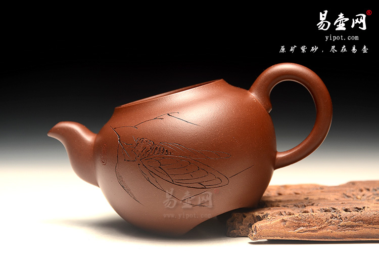 壶盖鼓起若帽,光泽和顺,和壶身相呼应。壶钮圆润如一粒珠,憨厚可爱,更适于拿捏。二弯流壶嘴更显灵动,出水利落干脆。端把骨肉亭匀,线条流畅自然,端握有力称手,便于把玩。壶的正面是刻绘的是蝉图。壶的背面刻有“唯吾知足”,字体融合一体,新颖、韵味十足,具有极高的的珍藏观赏价值。