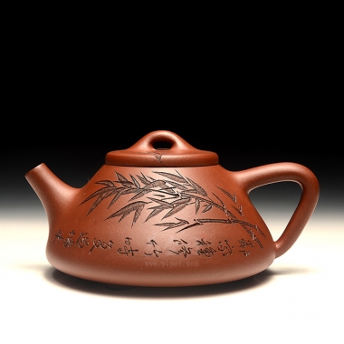 壶身刻绘有竹子图,“邻家种修竹,时复过墙来。一片青葱色,居然为我栽”,由实力派陶刻家钱汀刻绘装饰而成。