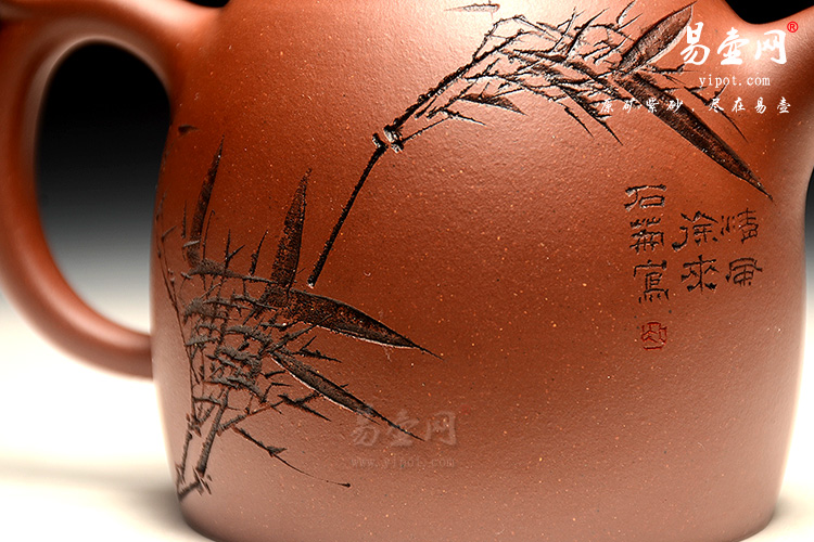 壶身刻绘一面刻绘“雨过琴书润,风来翰墨香”,另一面清风徐来,清风竹韵图。