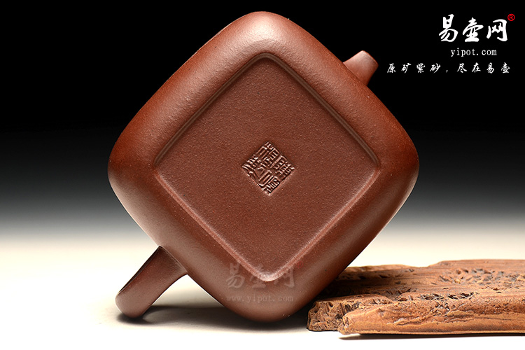 壶身呈四方型,上部圆滑,底部平整,四面均光洁美观,实在动人。压盖对接严丝合缝,壶盖饱满,正好与壶身呈大小对应。珠型钮圆中有方,精巧可爱。弯流壶嘴细润小巧,与飞把左右对应。整款作品气韵飘逸而不失真切,当真是有隐逸的味道。