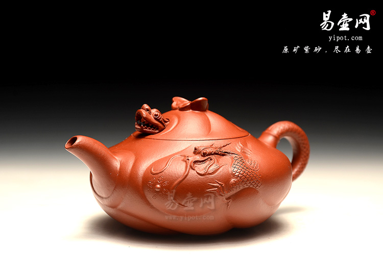 此壶质感柔亮,红润细腻,大放异彩。鱼化龙以神话故事为题材创作而来,作品构思巧妙,将鱼、龙以及云的装饰与壶融为一体。此款作品经过 老师的精心制作,刻绘精细,出神入画,就感觉真有一条龙在其上盘旋。壶盖上的龙头可动,十分的奇巧俏丽,整款作品制作浑厚有力,精致而不繁琐。此壶兼具实用价值和艺术价值,值得珍藏。