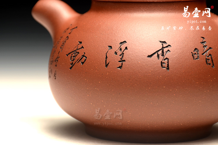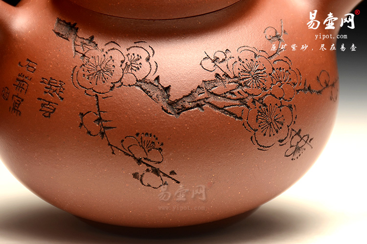壶身为扁圆球型,线条饱满,轮廓柔和,如同水中长年累月打磨过的石头。壶底加圈足,和壶颈部上下对应,优雅气韵由此顿生。壶盖饱满圆润,如一滴晃动的墨水。盖上的圆珠壶钮圆滑可爱,精妙可人。壶把的壶嘴的线条非常明朗,与壶身相比似有些过于清晰,但正是因此,此壶特别的味道才更加浓厚。壶身正面铭文刻绘“暗香浮动”,背面镌刻有寒梅凝香图。