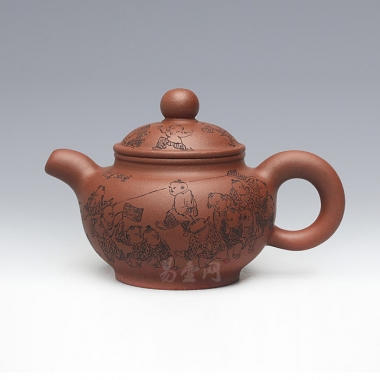 此款天乐壶与前面介绍的一款三友壶有异曲同工之妙,皆以圆润饱满的壶体为主,且壶身刻绘相同,以百子图为主题,然刻绘主相同,百子表现形式以及形态却全然不同,可见刻绘者其高超的刻绘技艺。
